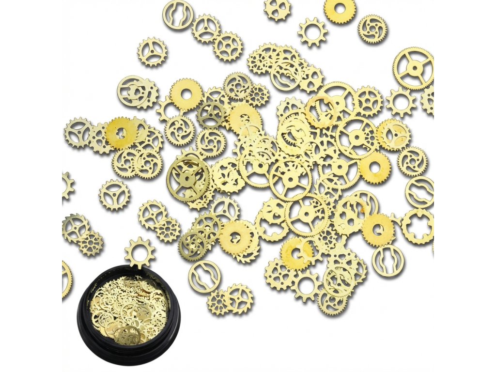 Metalldekorationen zur Verwendung in Kunstharz in Form von gezahnten Uhrrädern, die nicht nur in reinem, transparentem Kunstharz, sondern auch auf einem farbigen Hintergrund zur Geltung kommen.