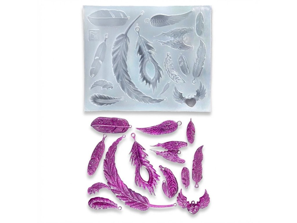 Silikonform zur Herstellung von Anhängern. Mit dieser Form können Sie schöne, zarte, dünne Federn herstellen, die Sie als Halsschmuck oder Ohrringe verwenden können. Sie können die Abgüsse für die weitere Produktion verwenden, z. B. für ein Windspiel - hängen Sie sie einfach an Schnüre oder gießen Sie die Federn in Untersetzer.