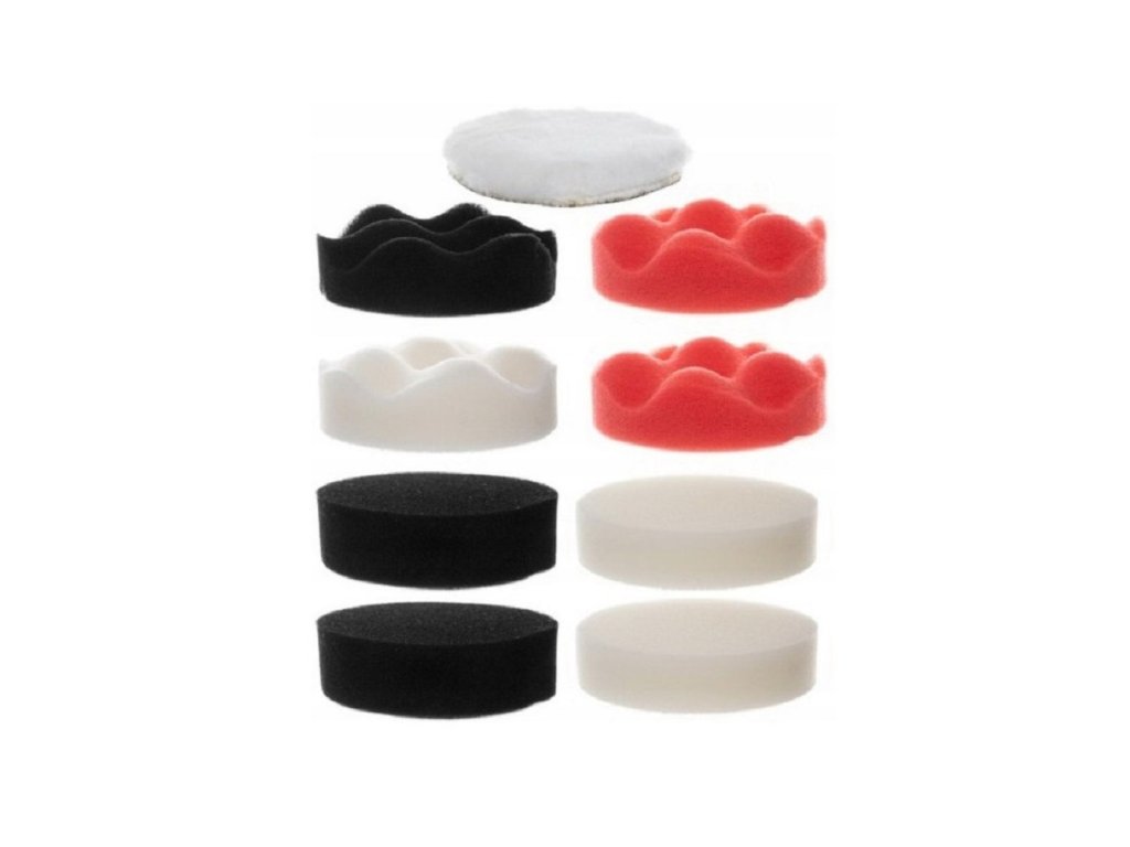 Sada obsahuje 5 druhů vlnitých leštících houbiček, 4 ploché leštící houby na suchý zip, 1x leštící kožešinu na suchý zip, 1x hlavu tlumiče se suchým zipem a montážní adaptér. Rozměry houbiček v sadě 8 x 8 x 4 cm.