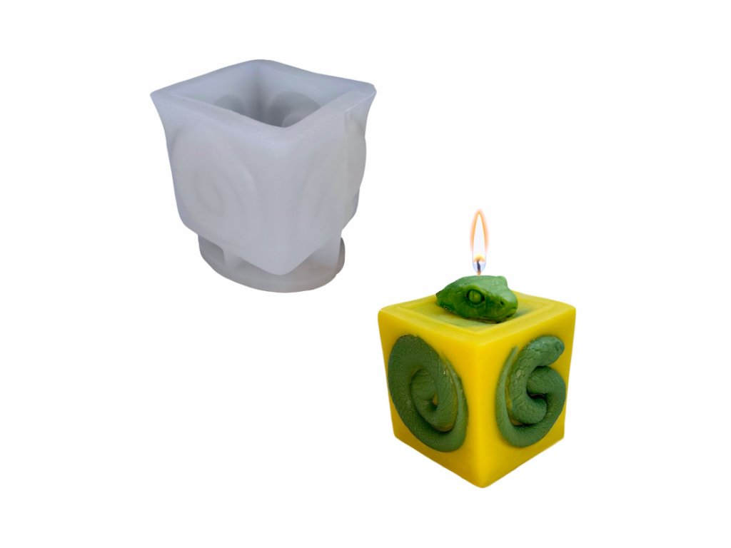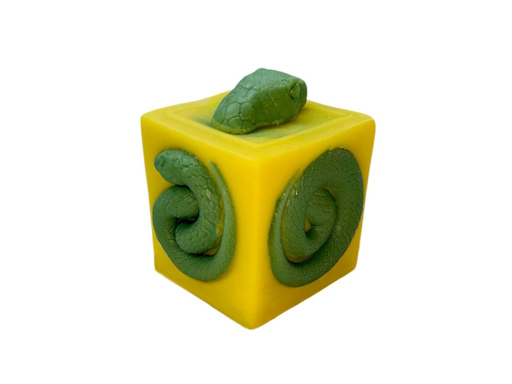 Silikonová forma na výrobu kostky s hadem. Forma je vhodná na vosk, mýdlovou hmotu a za studena odlévané hmoty.