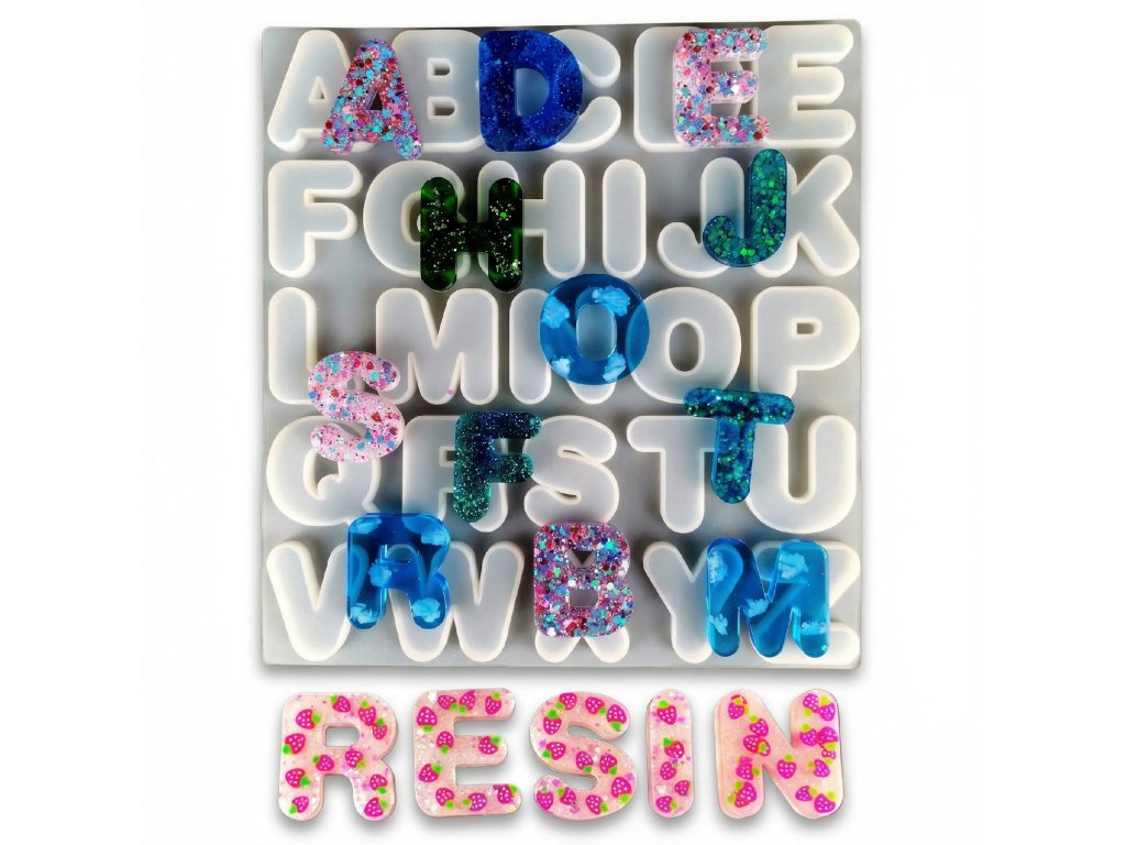 Silikonová forma na výrobu písmenkových klíčenek. Forma je vhodná pro epoxidovou pryskyřici, UV pryskyřici a další za studena odlévané hmoty jako je NatuResin, sádra, beton atp.