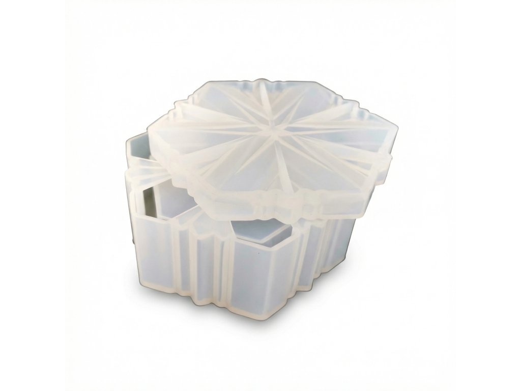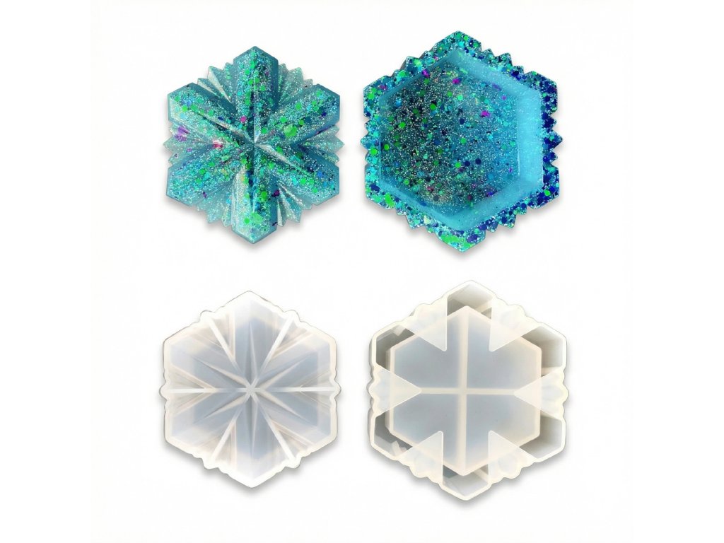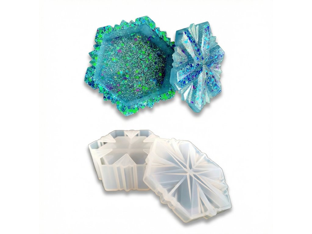 Dvoudílná silikonová forma na výrobu vroubkované krabičky s víčkem ve tvaru vločky. Forma je vhodná pro epoxidovou pryskyřici a další za studena odlévané hmoty jako je NatuResin, sádra, beton atp.