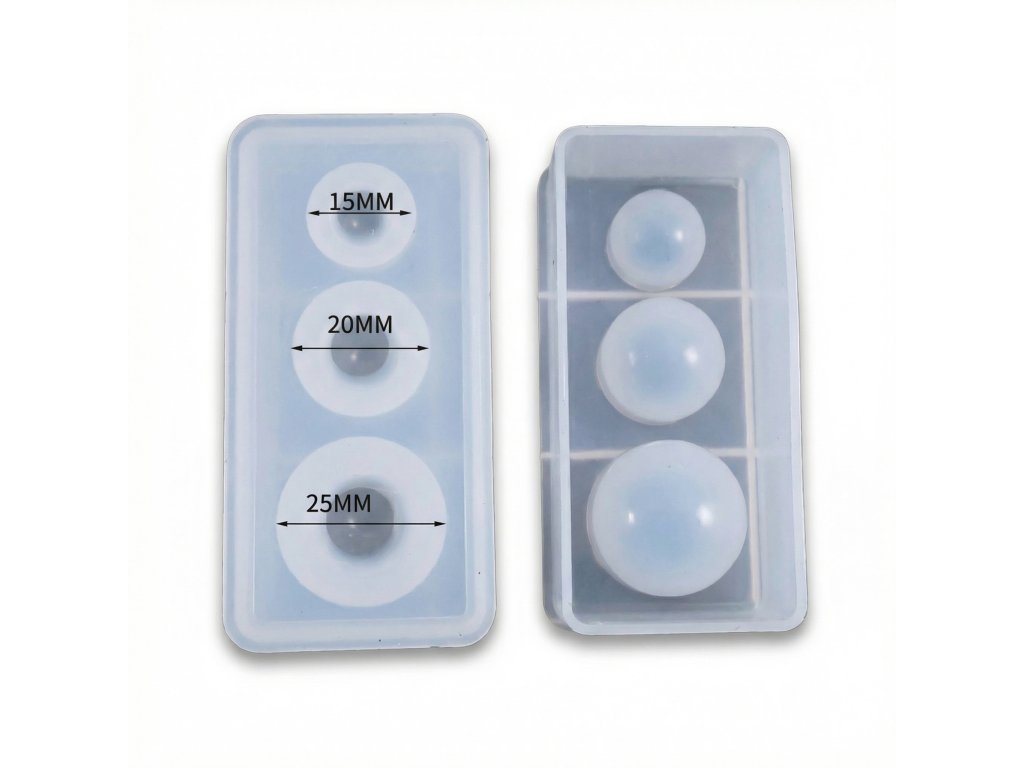Silikonová forma na výrobu přívěšků a klíčenek ve tvaru kuliček tří velikostí. Forma je vhodná pro epoxidovou pryskyřici a další za studena odlévané hmoty jako je NatuResin, sádra, beton atp.