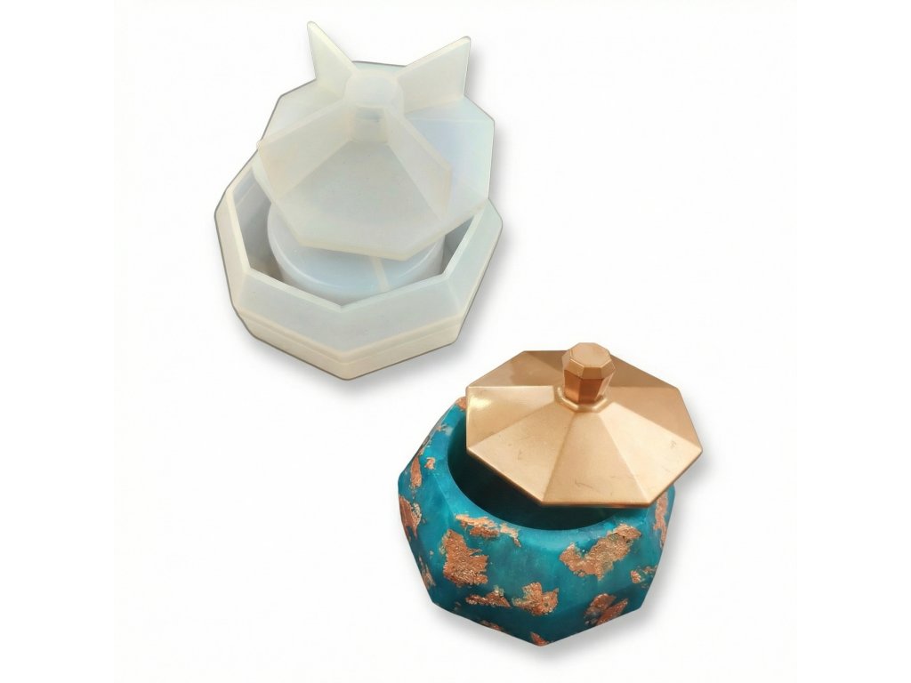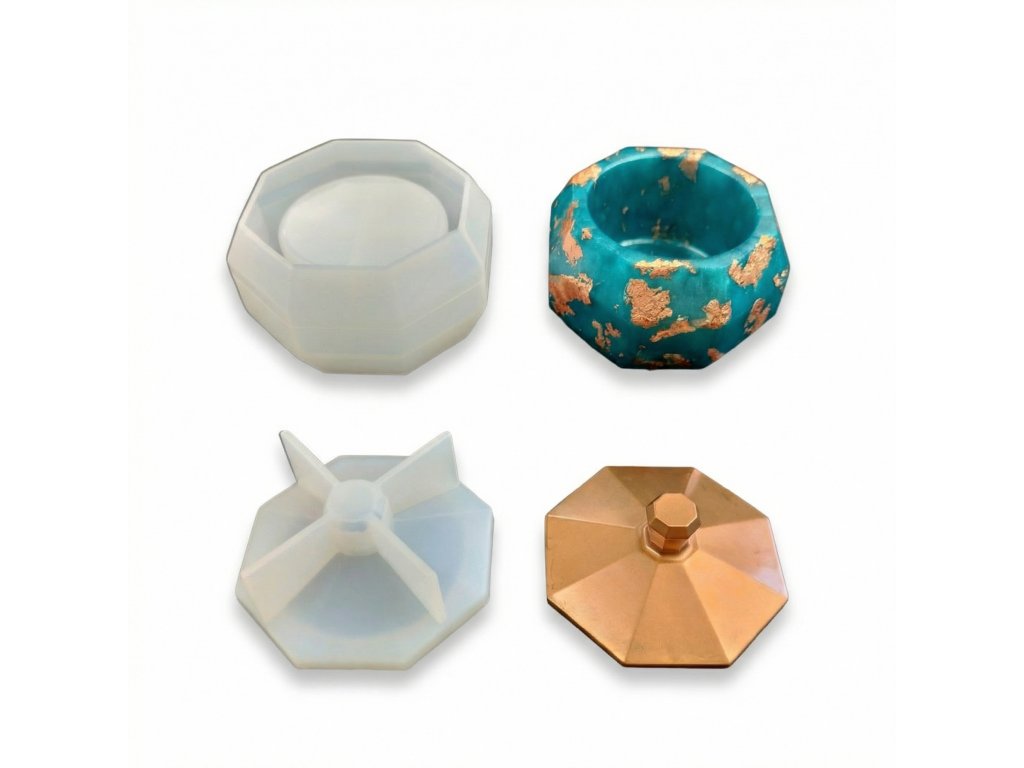 Dvoudílná silikonová forma na výrobu osmihranné krabičky s víčkem. Forma je vhodná pro epoxidovou pryskyřici a další za studena odlévané hmoty jako je NatuResin, sádra, beton atp.