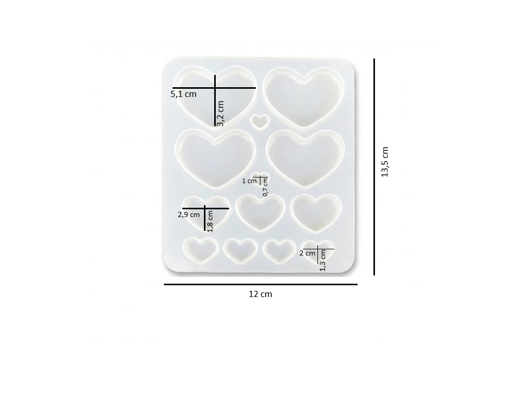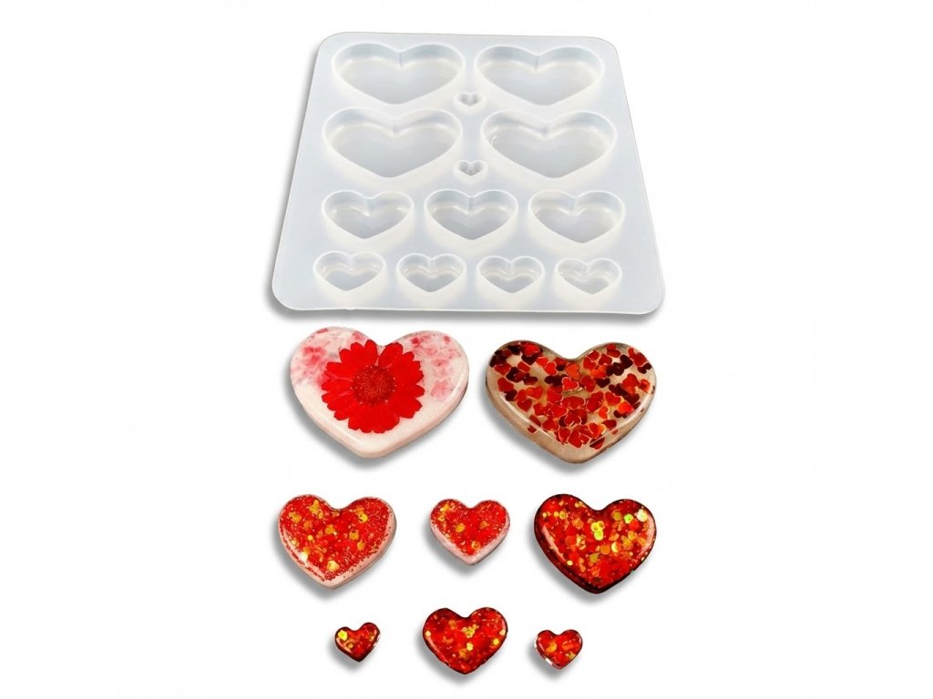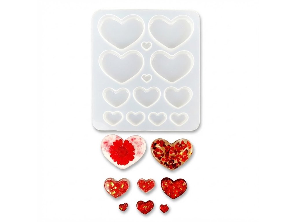 Silikonová forma na výrobu srdíček. Odlitky můžete použít jako samostatnou dekoraci, nebo pro další tvoření jako jsou klíčenky, šperky, podtácky nebo do hodin. Forma je vhodná pro epoxidovou pryskyřici, UV pryskyřici, squishy gel a další za studena odlévané hmoty jako je NatuResin, sádra, beton atp.