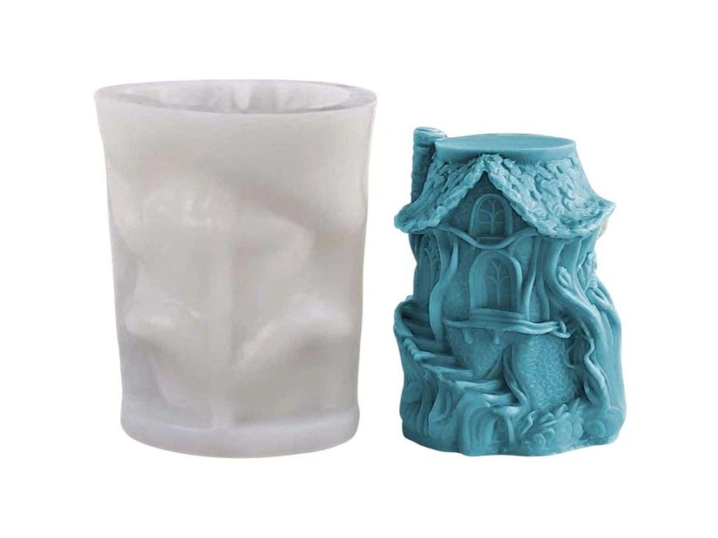 Silikonová forma na výrobu svíček ve tvaru lesního domečku.
