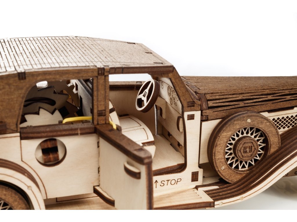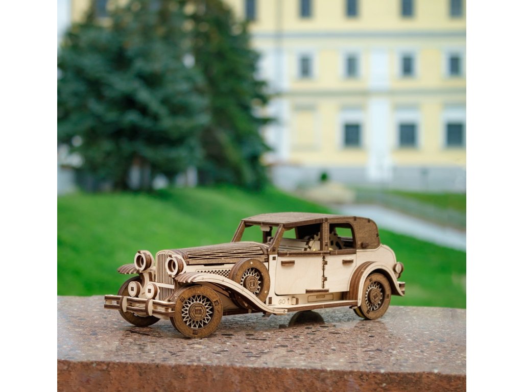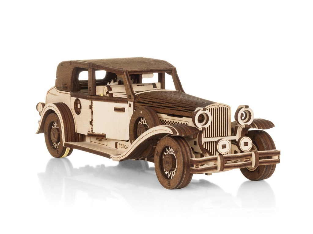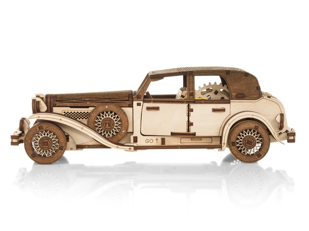 Objavte originálnu 3D drevenú stavebnicu. Toto retro auto je mechanická skladačka, ktorú si sami zostavíte a ktorá sa po natiahnutí samostatne pohybuje vďaka šikovnému mechanickému pohonu vo vnútri. Žiadne batérie, len čistá mechanika a precízne spracované, pevné dieliky z brezovej preglejky.