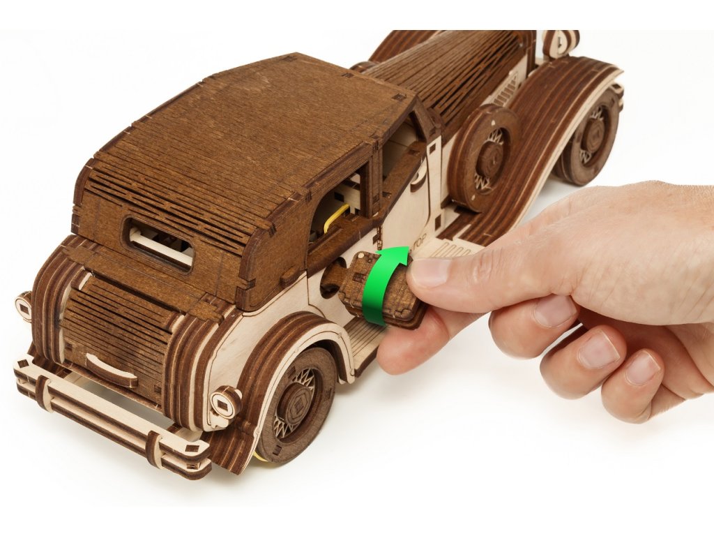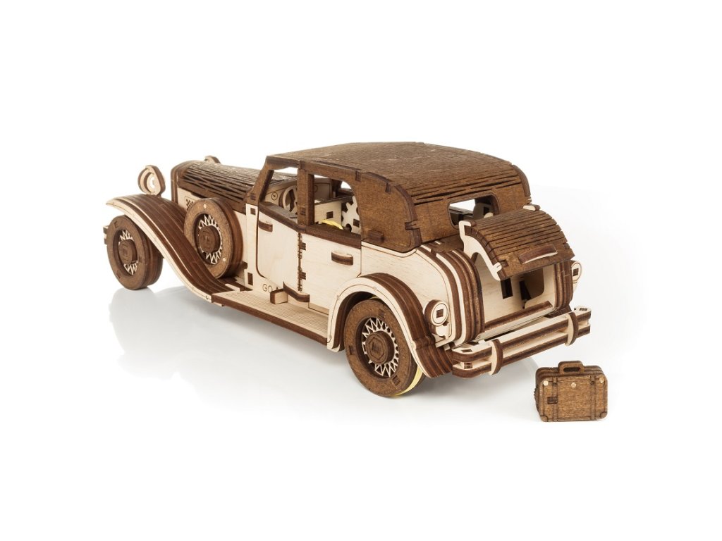 Toto retro auto nielenže upúta pozornosť, ale je vybavené aj pružinovým mechanizmom, ktorý mu po natiahnutí umožňuje pohyb vpred. Auto sa naťahuje štýlovým kľúčom v tvare kufra, ktorý sa zmestí do batožinového priestoru vozidla. Vytvorte si svoje jedinečné auto inšpirované vozidlami 30. a 40. rokov 20. storočia a užite si proces skladania!