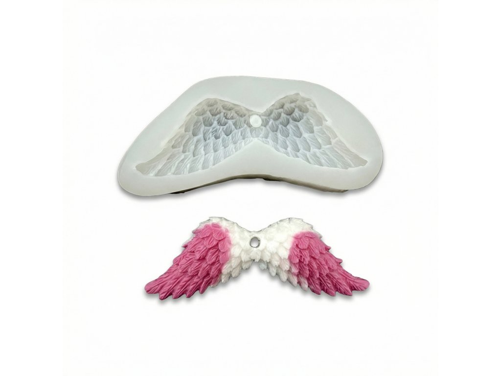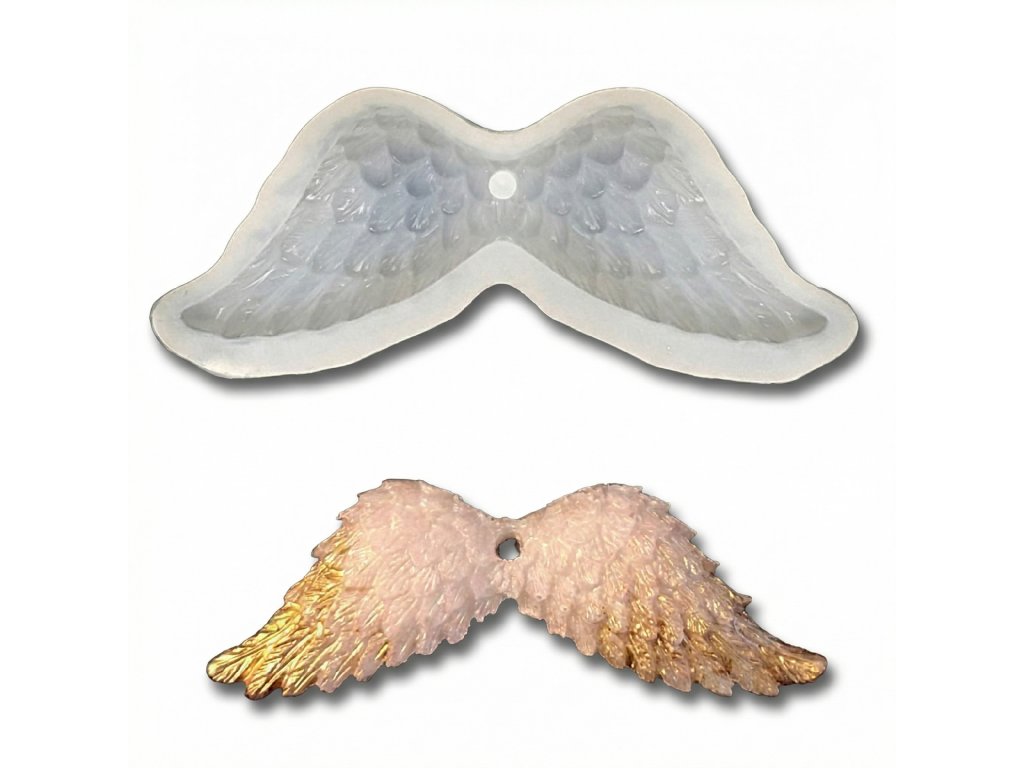 Silikónová forma na výrobu závesných anjelských krídel z epoxidovej živice. Anjelské krídla môžete zavesiť na stuhu a premeniť ich na vianočnú dekoráciu. Pomocou našich šperkových komponentov si z nich môžete vyrobiť aj krásny prívesok na kľúče.
