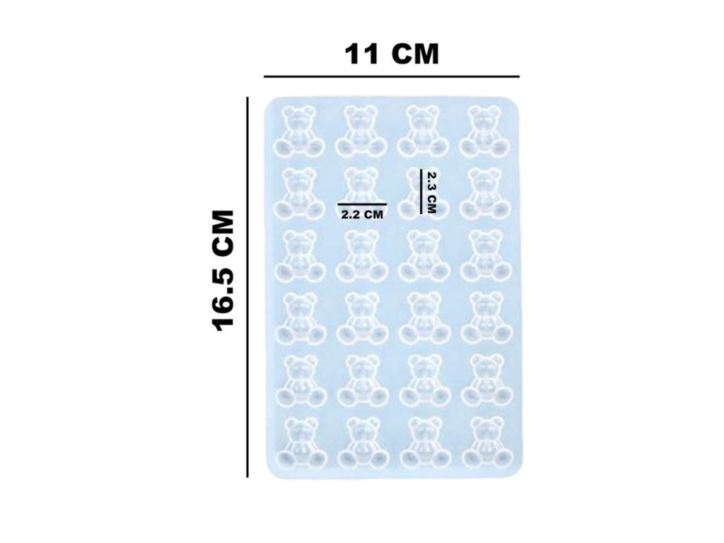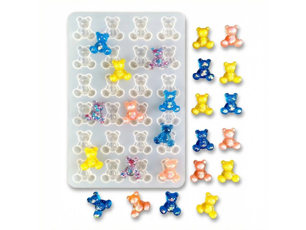 Silikónová forma na výrobu medvedíkov. Odliatky z tejto formy vyzerajú presne ako gumené medvedíky. Môžete z nich vyrobiť náušnice, prívesky, kľúčenky alebo slizové ozdoby pre deti.