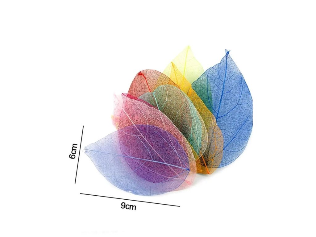 Přírodní listy preparované technikou skeletování, které jsou následně barvené do mnoha barev, které najdete v naší nabídce. Listy jsou skeletované ručně a každý je tak jedinečný. Barvené listy v pryskyřici nepouští barvu.