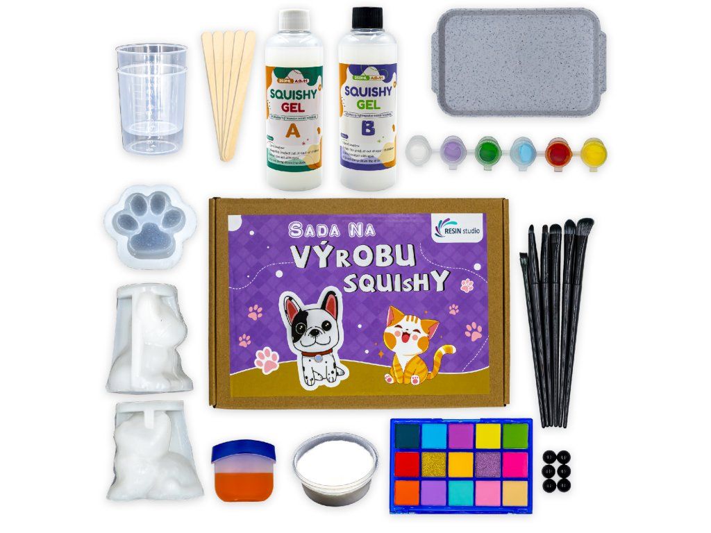 Vyrobte si své vlastní squishy! S touto kreativní sadou si vytvoříte hit internetu – taba squishy, které budou barevné a lepivé nebo s heboučkým chlupatým povrchem díky flokovacímu prášku. Stačí jen smíchat gel a obarvit, vymazat formu, nalít a po pár hodinách máte v ruce báječný antistresový kousek. Aby se squishy brzy neponičily, najdete v sadě i zip sáčky, do kterých je schováte.